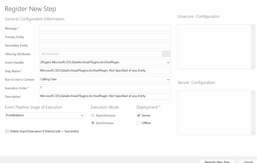 When you register a plugin step using the Plugin Registration Tool, you’ll be presented with a configuration screen that defines when and how your plugin executes.