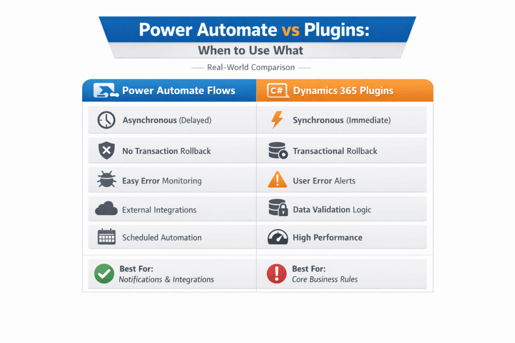 Power Automate vs Plugins is one of the most common and confusing decisions in real Dynamics 365 projects. Choosing the wrong approach can lead to performance issues, failures, and frustrated users.